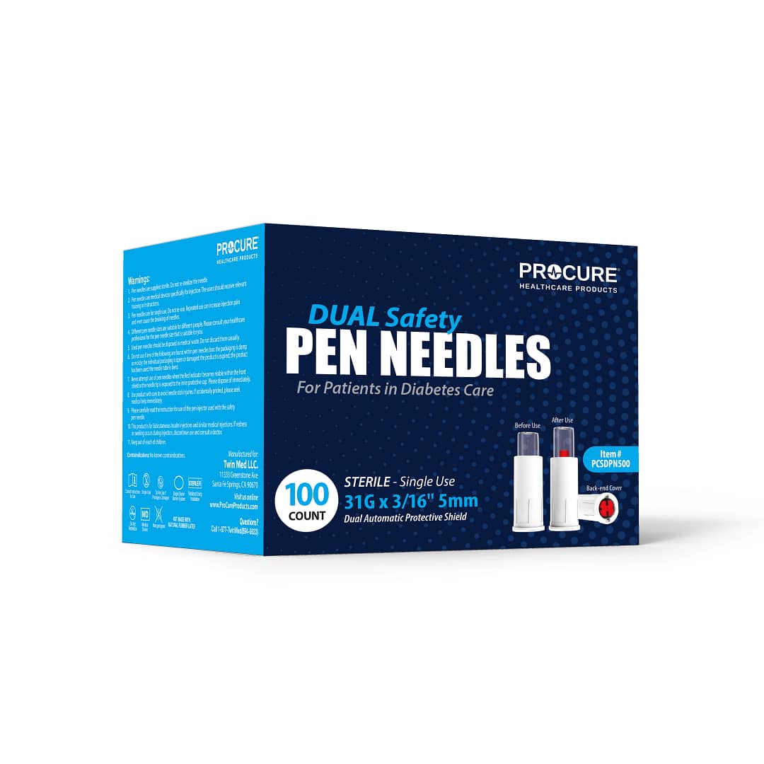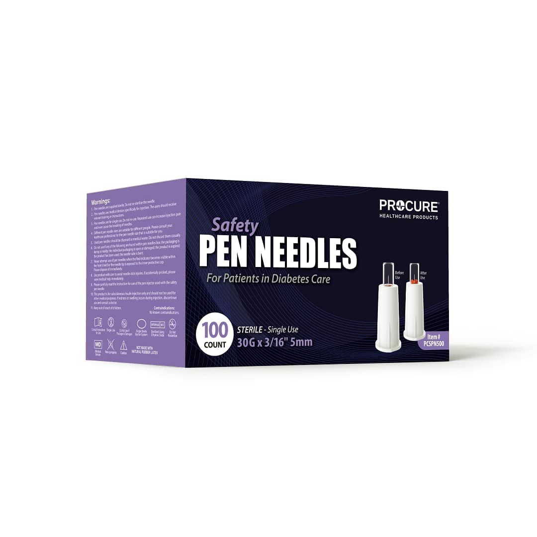 ProCure Safety Pen Needles are ideal for patients managing diabetes as they are designed for safe and comfortable insulin delivery. Featuring an automatic protective shield, they help prevent accidental needlestick injuries while ensuring precise and painless injections. Compatible with most insulin pens, they offer a secure, user-friendly solution for daily diabetes care.