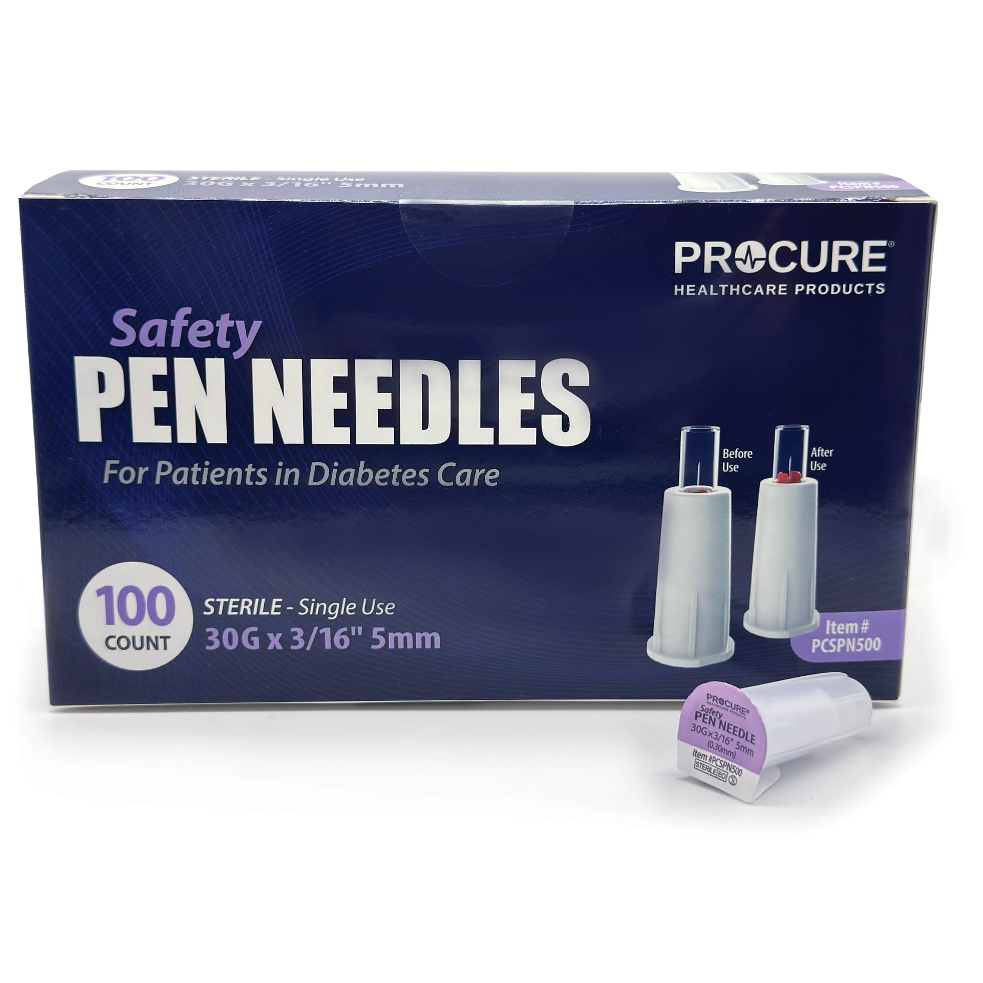 PCSPN500: Safety Pen Needles | 30G x 3/16” 5mm | 100/box 12 boxes/case