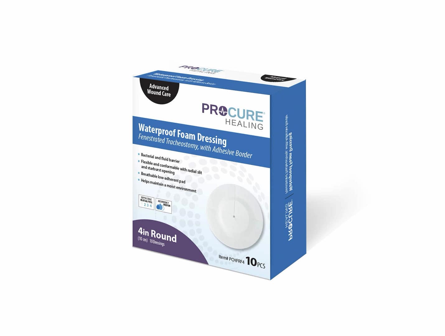 ProCure Waterproof Foam Dressing with Adhesive Border is a moderately absorbent, waterproof sterile foam dressing. It is structured to retain moderate exudate, while maintaining a moist wound environment. The dressing has a waterproof adhesive backing and a sterile foam cushioning that easily adheres to the skin and seals the wound bed, protecting against bacterial contamination. The waterproof outer layer of the dressing prevents water or other liquids from penetrating the wound site, making it ideal for use in wet environments or for patients who may need to shower or bathe while wearing the dressing. The adhesive border provides a secure and comfortable fit, helping to keep the dressing in place and preventing it from slipping or rolling.